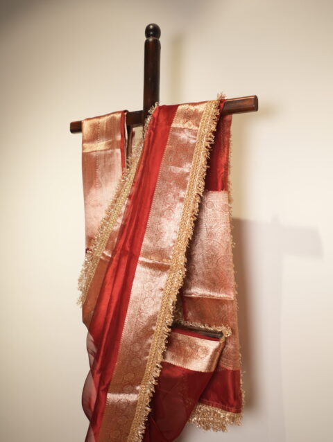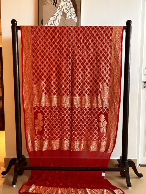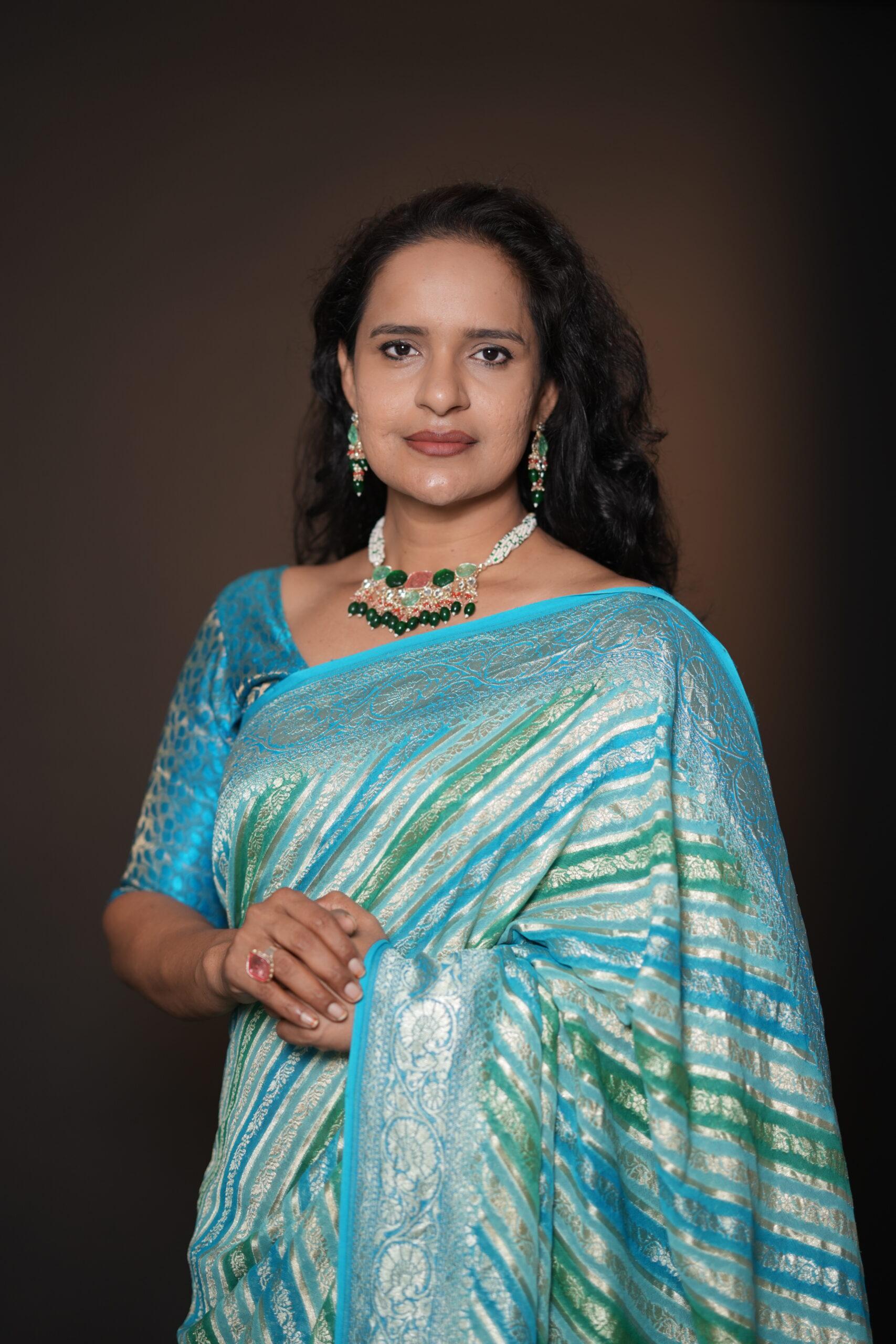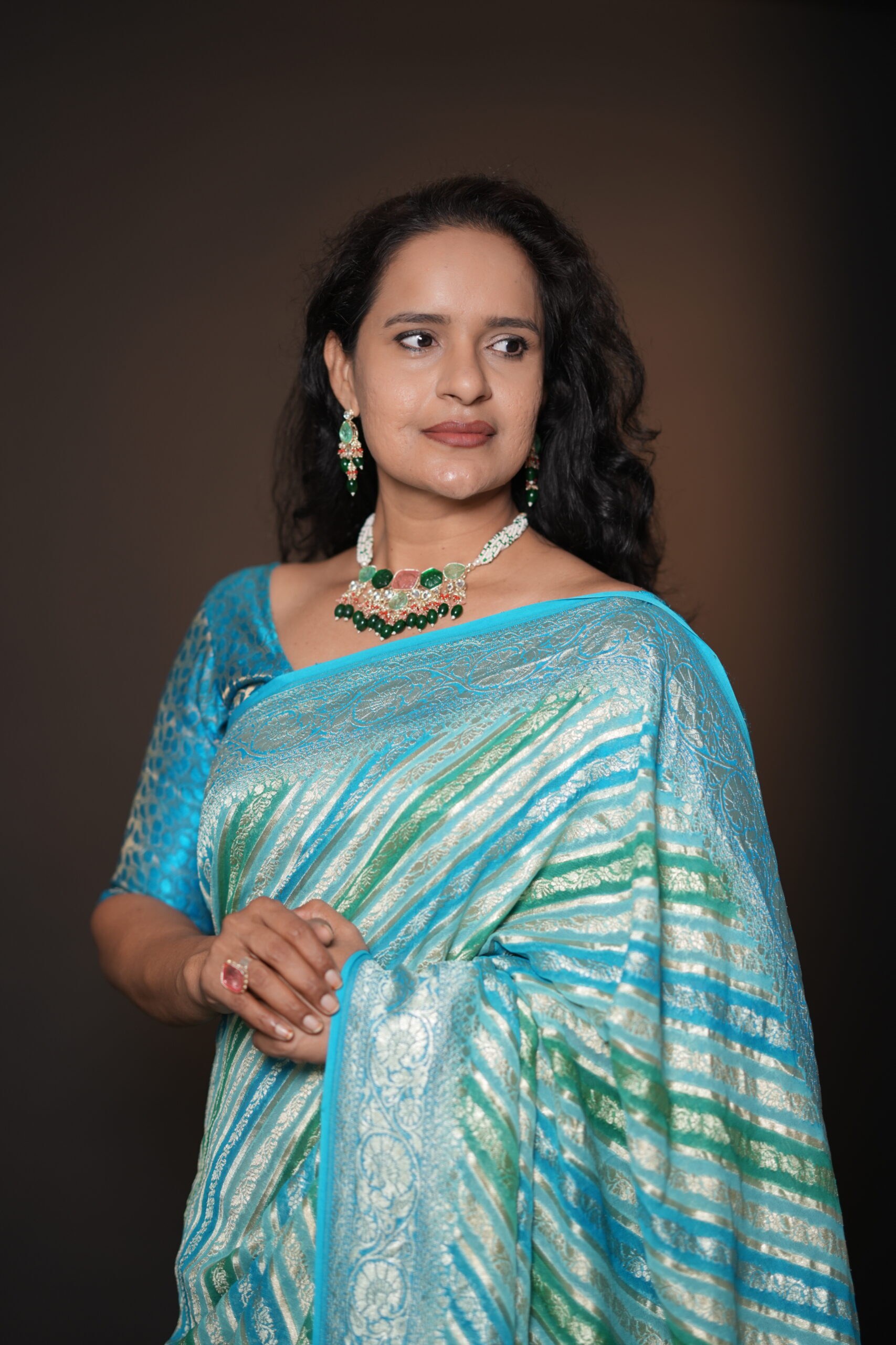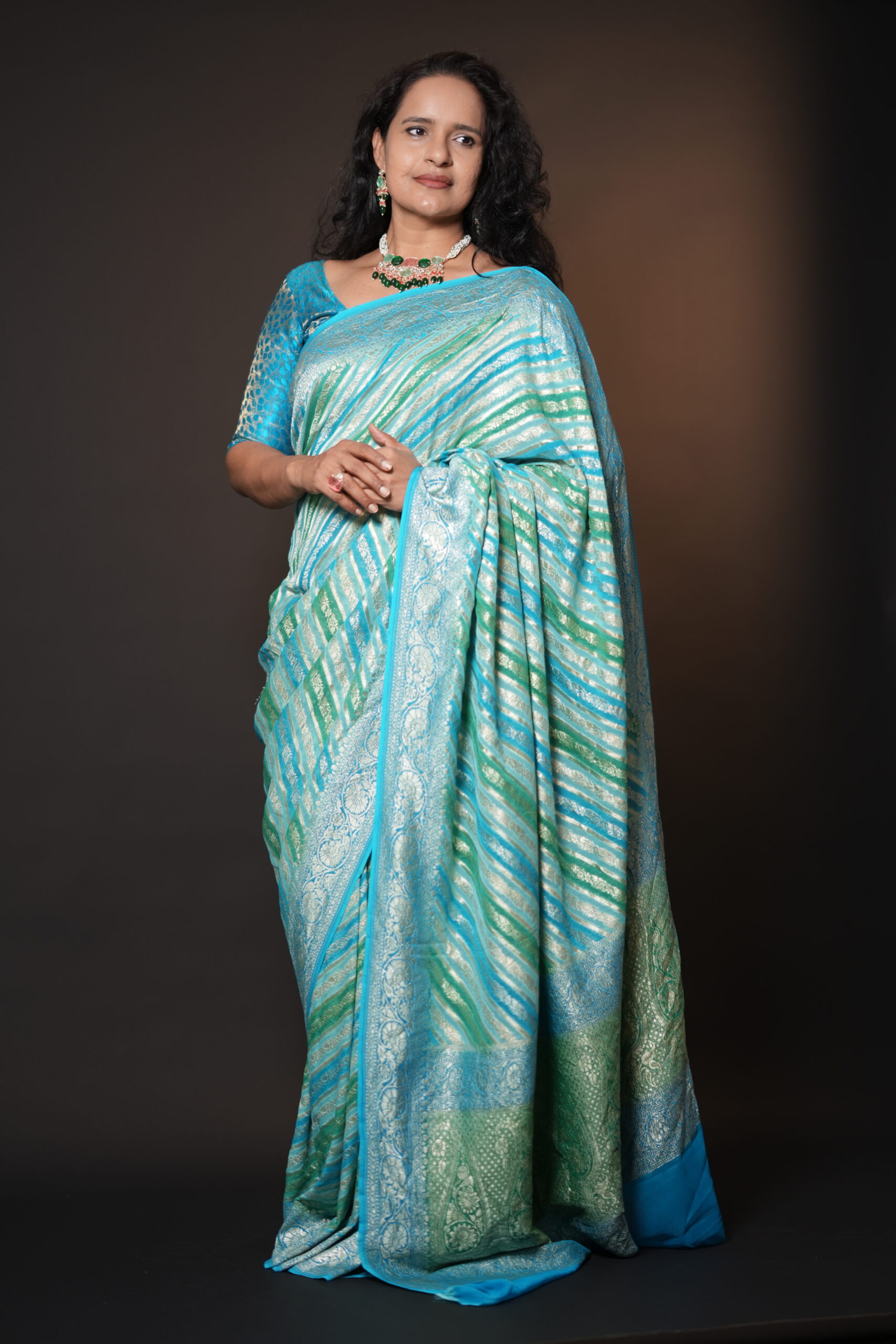 Khadi Georgette Banarasi Lehariya Rankat Concept Saree Elevate your festive wardrobe with this exquisite Khadi Georgette Banarasi Saree, crafted in the unique Rankat weaving concept. The saree beautifully blends the timeless charm of Banarasi craftsmanship with the fluid elegance of khadi georgette. Featuring a graceful lehariya-inspired pattern, each drape carries a rhythmic flow of colours and textures, highlighted with delicate zari artistry. Lightweight, airy, and effortlessly elegant, this saree is perfect for celebrations, weddings, and grand occasions where you want a statement look with refined traditional aesthetics.