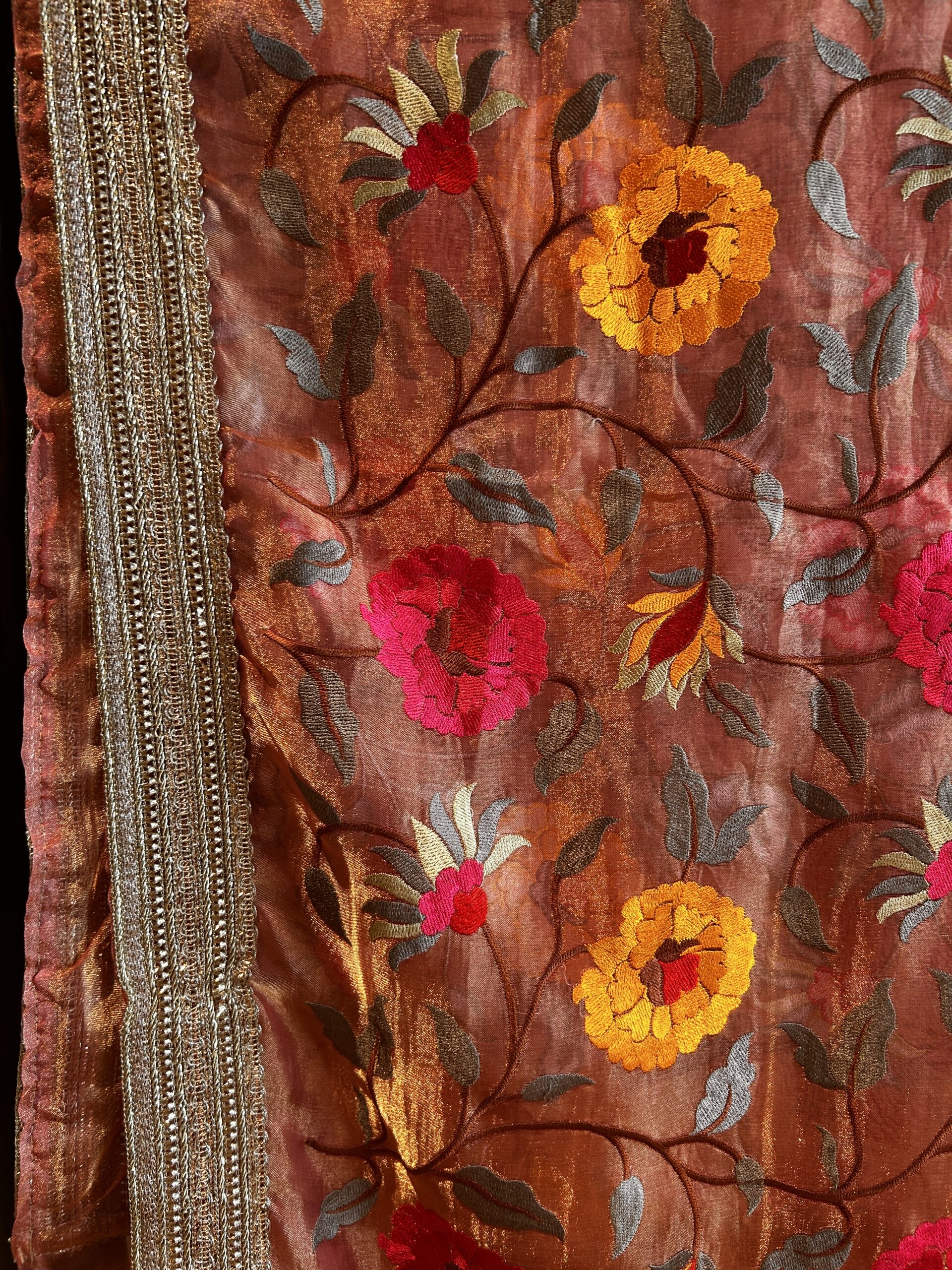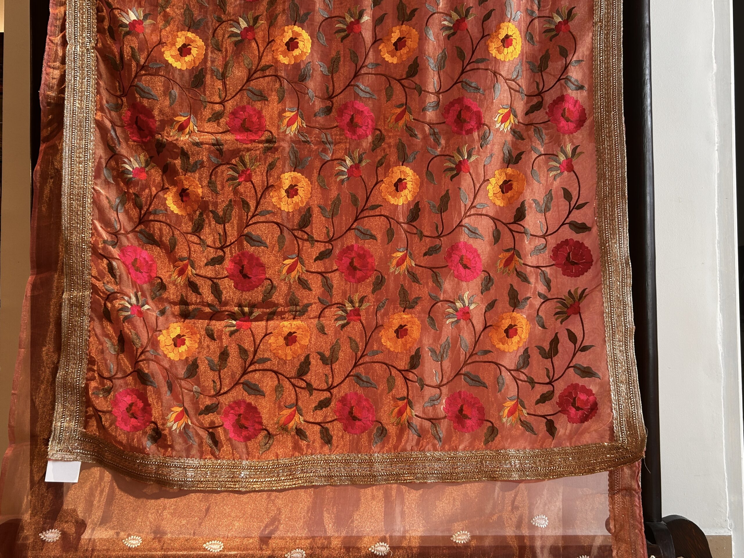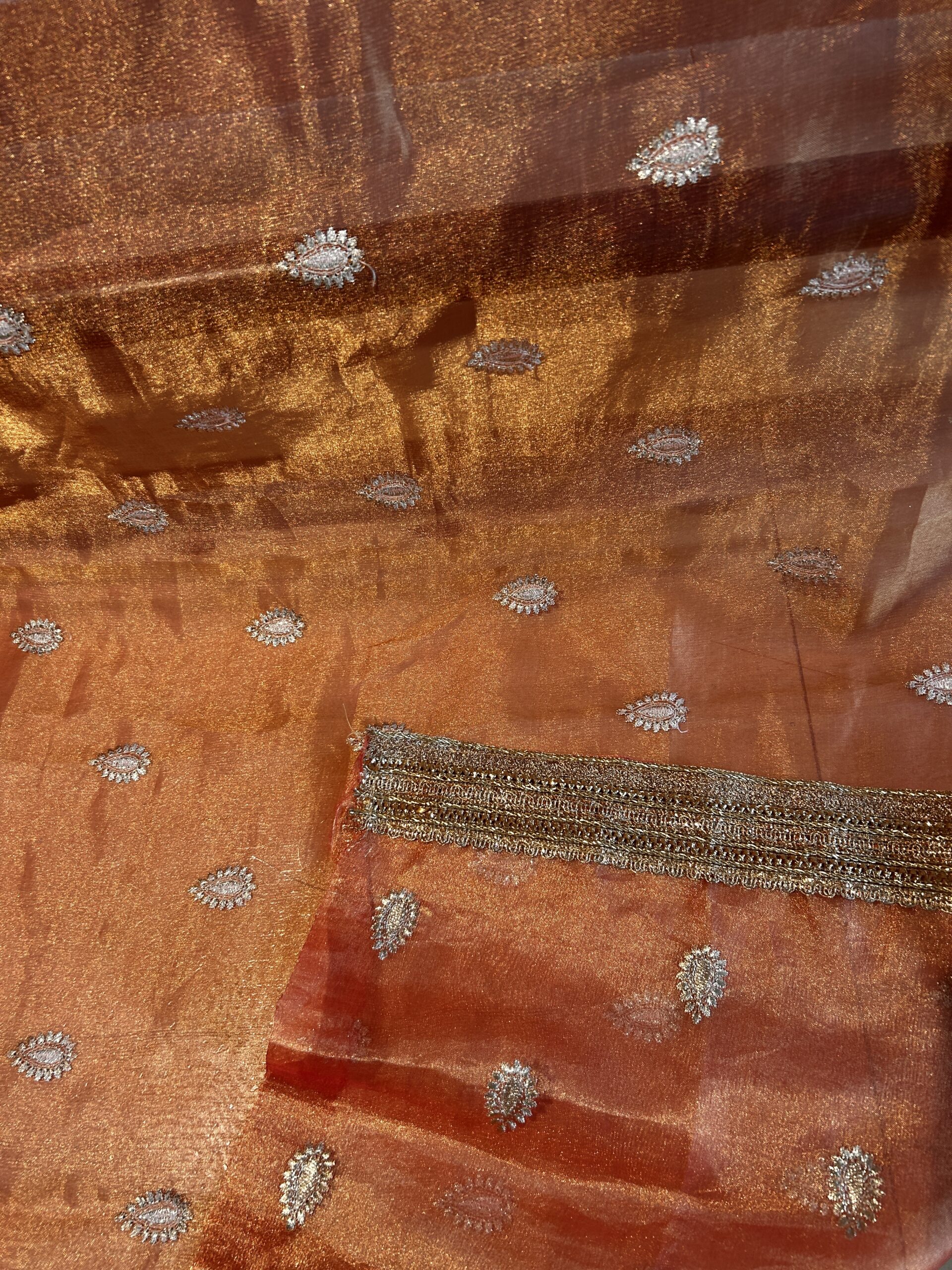 Indulge in timeless elegance with this luxurious Banarasi tissue saree, adorned with exquisite all-over embroidery that enhances its rich, shimmering texture. The saree is beautifully complemented with an attached customized tissue border, crafted to elevate the overall grandeur while maintaining a refined, contemporary charm. Perfect for weddings, festive occasions, and signature celebrations, this piece blends classic Banarasi artistry with modern finesse.
