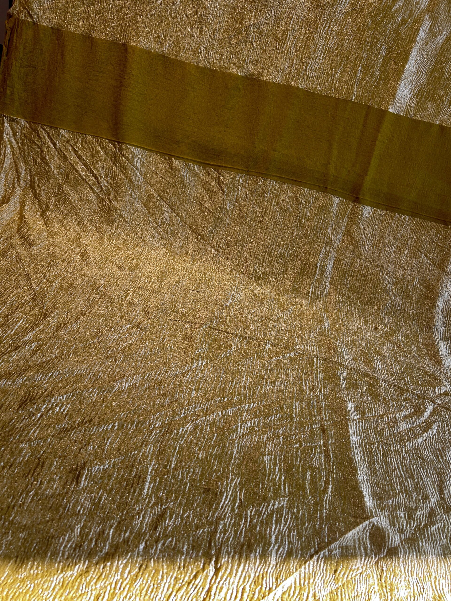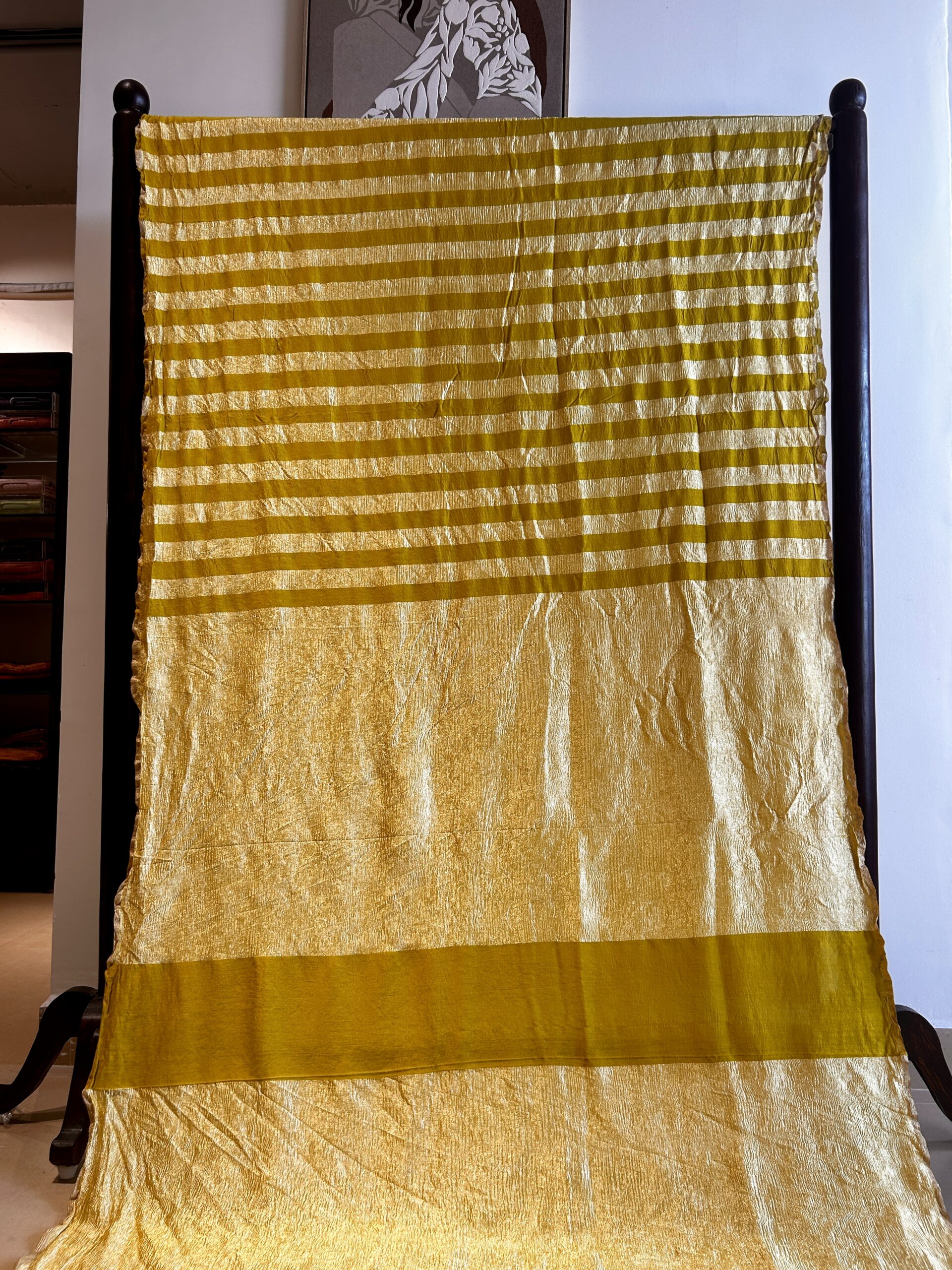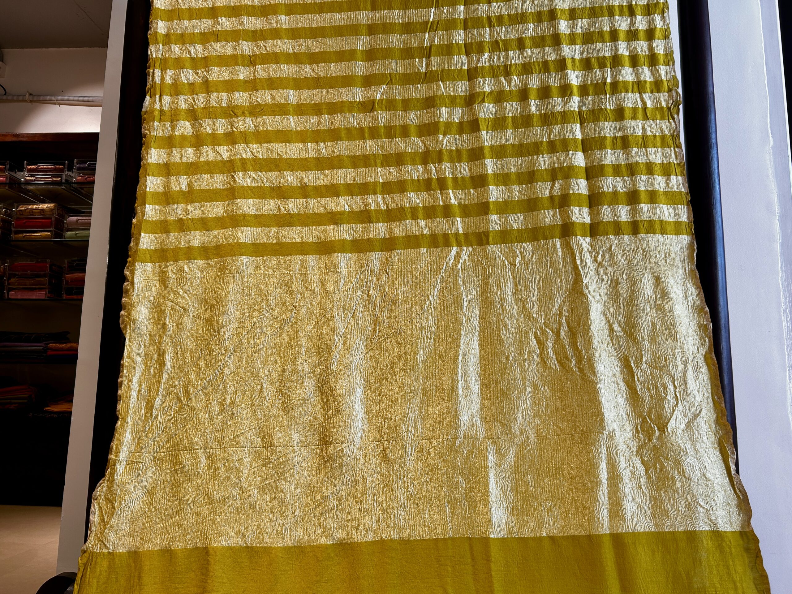 Elevate your wardrobe with this exquisite Monga Tussar saree featuring refined vertical stripes that add effortless sophistication. The body comes in a graceful, no-border silhouette, giving it a contemporary and lightweight appeal. A rich tissue zari pallu and matching zari-finish border bring a touch of regal shimmer, making the saree perfect for festive occasions, celebrations, and elegant evenings. A timeless blend of subtle texture and luxurious sheen, this saree is crafted for those who love understated grandeur.