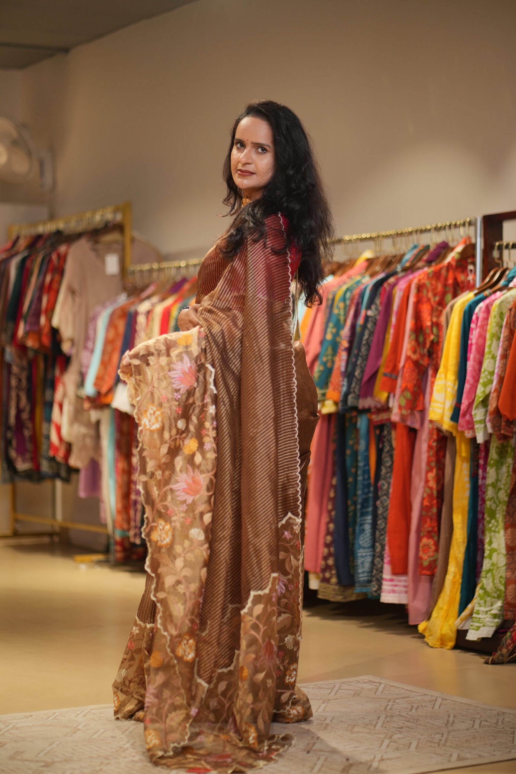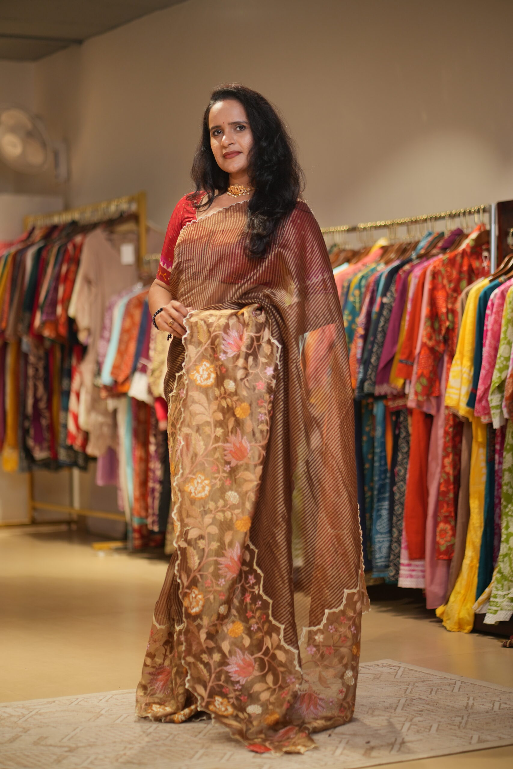 A timeless expression of Banarasi artistry, this pure handloom tissue saree exudes understated luxury and refined elegance. The saree features a luminous tissue base adorned with delicate diagonal weave textures that lend it a soft sheen and fluid drape. Enhanced with intricate floral motifs inspired by traditional Banarasi craftsmanship, the saree beautifully balances heritage with contemporary charm.