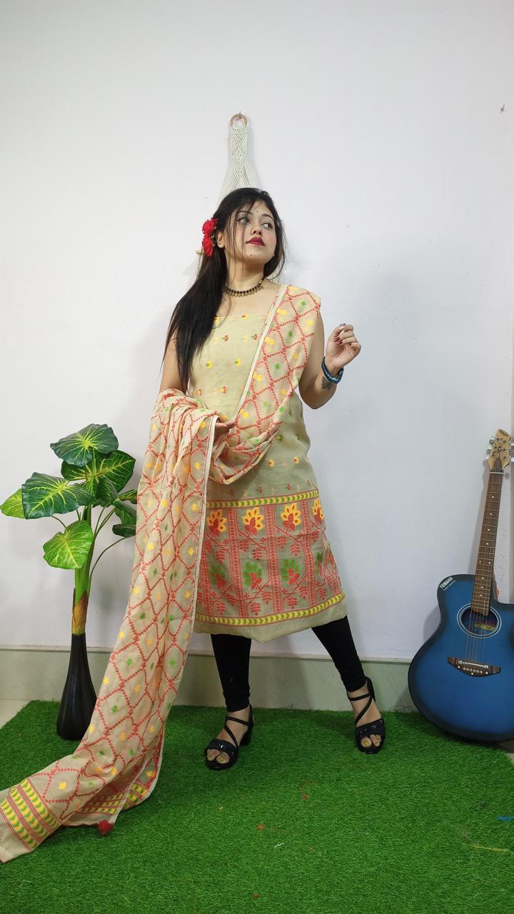 Elevate your ethnic wardrobe with this elegant 2-piece salwar suit set, handcrafted in pure handloom Jamdani weaving. The set features a beautifully woven kurta paired with a coordinated dupatta, showcasing intricate geometric and floral Jamdani motifs that reflect timeless artisanal craftsmanship.