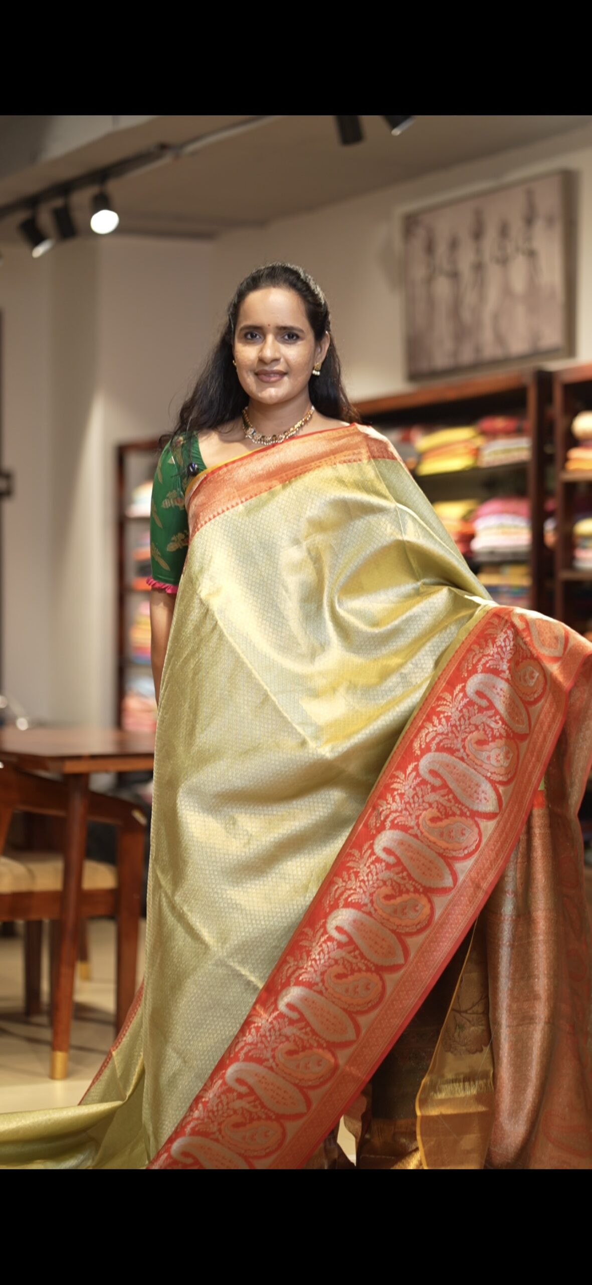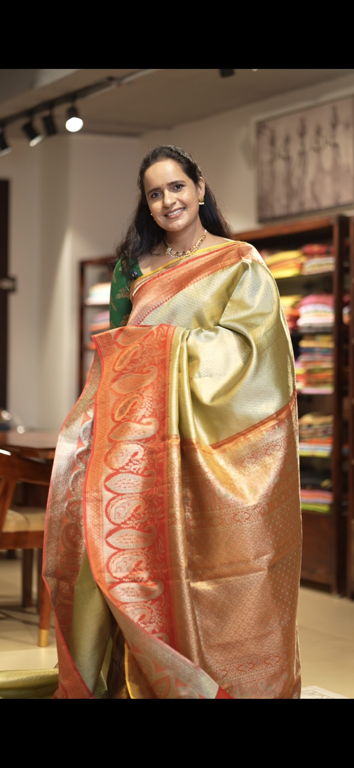 An exquisite celebration of South Indian heritage, this pure Kanjivaram tissue saree is a timeless masterpiece handwoven by skilled artisans. Crafted in luminous tissue silk, the saree exudes a rich golden sheen that beautifully enhances its regal appeal.