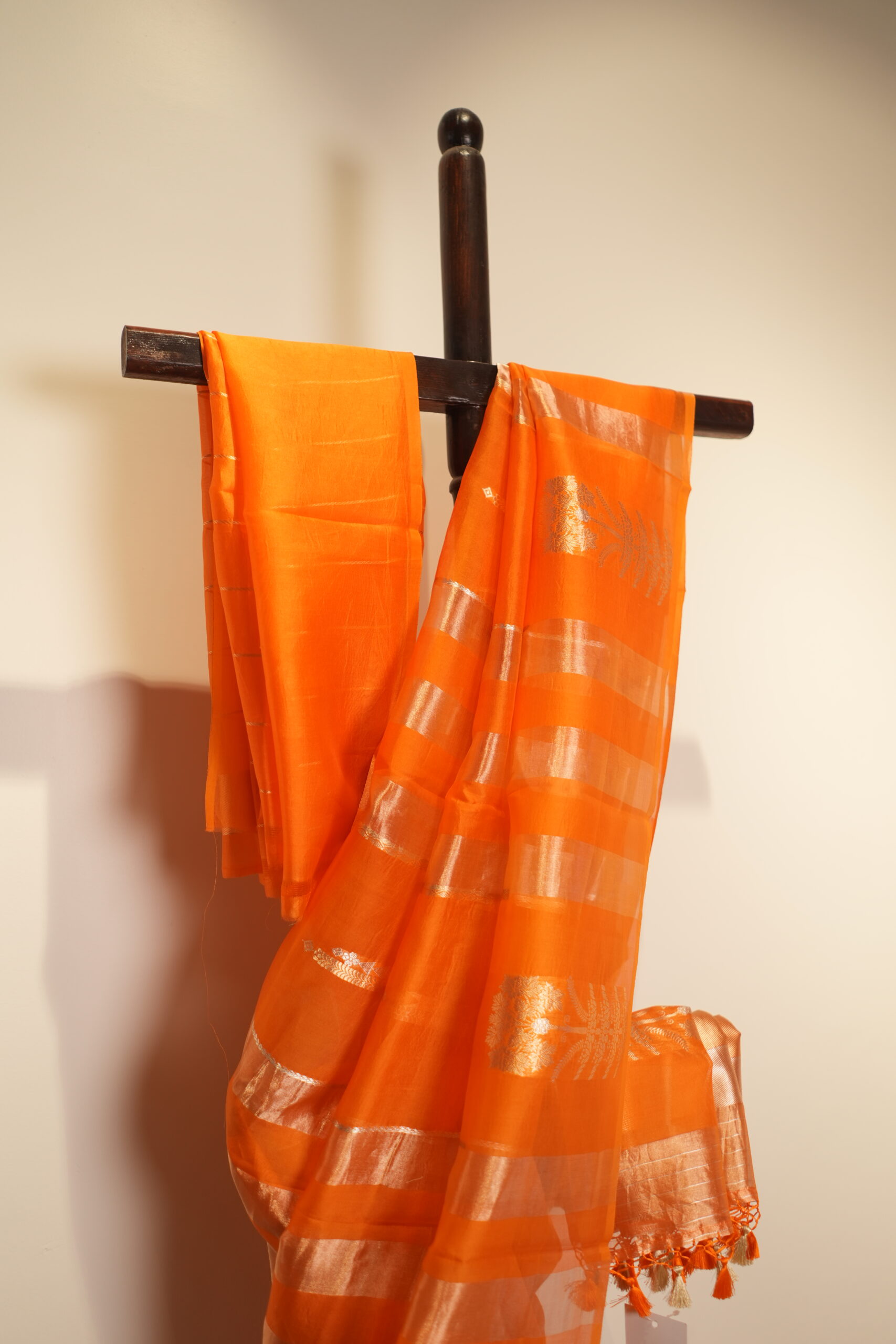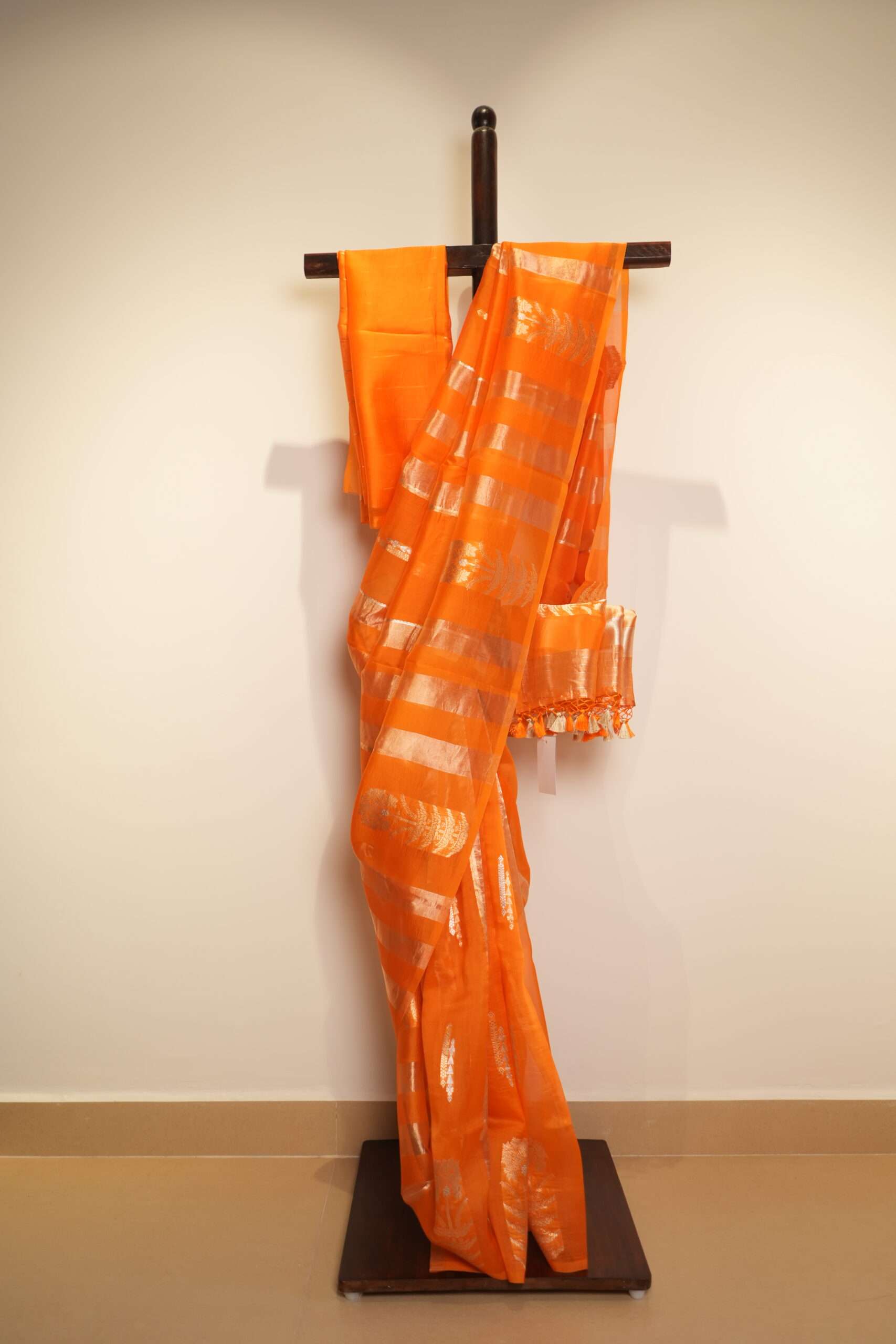 Discover timeless artistry with this kora Banarasi saree featuring an intricately striped body that reflects the finesse of traditional weaving. The highlight of the drape is its beautifully crafted, heavy kadua woven border — a hallmark of Banarasi craftsmanship known for its durability, richness, and detailed handwork. Lightweight yet regal, this saree blends sheer elegance with luxurious texture, making it perfect for weddings, festive occasions, and grand celebrations. A true collectible for lovers of heritage Banarasi weaving.