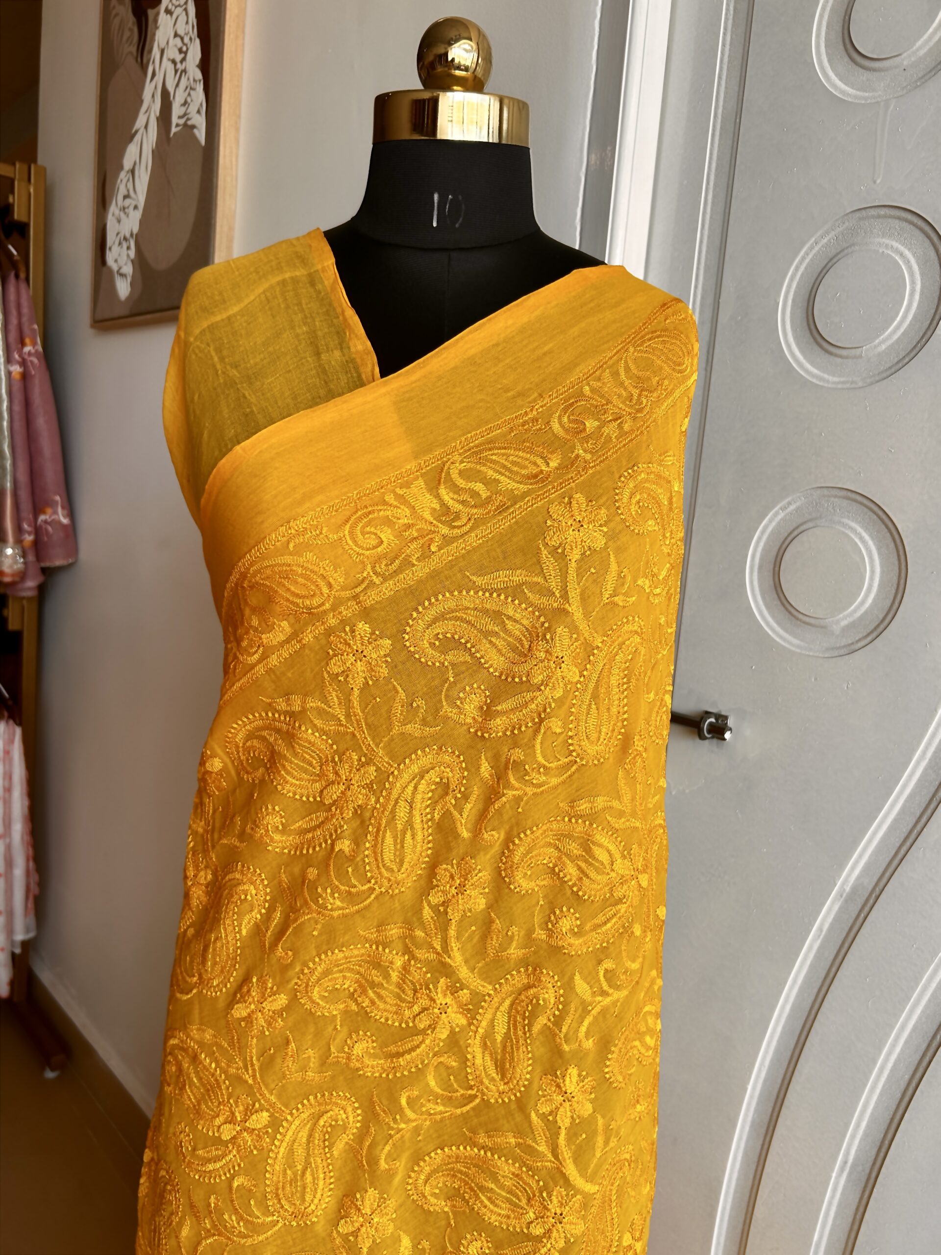 Ideal for summer wear, casual gatherings, office elegance, and intimate festivities, this saree blends traditional craftsmanship with understated sophistication. Pair it with minimal jewellery to let the embroidery shine.