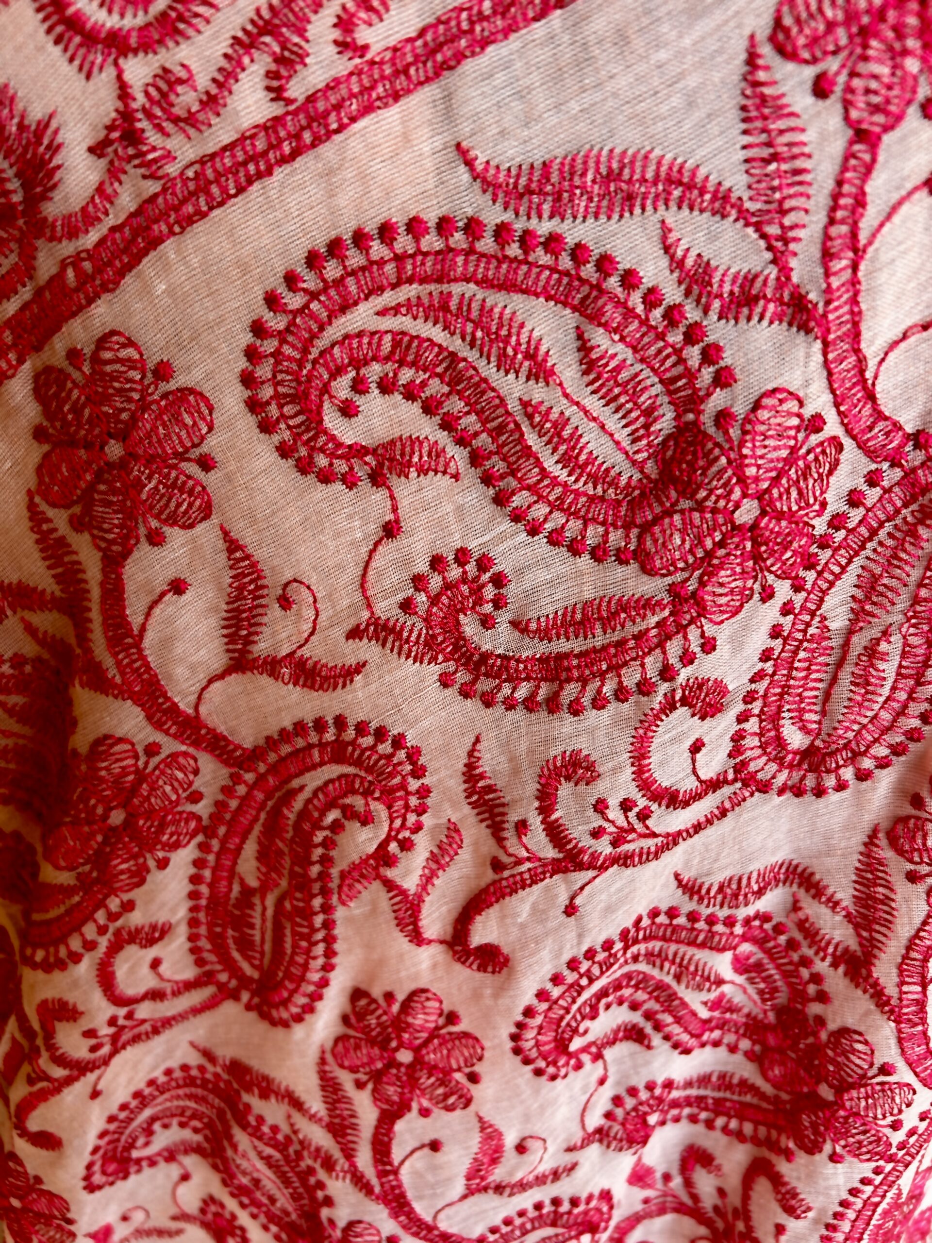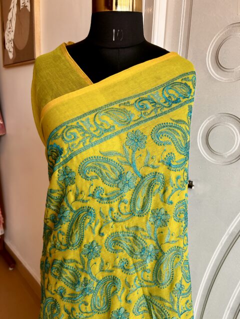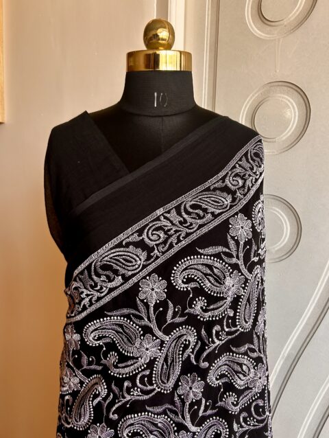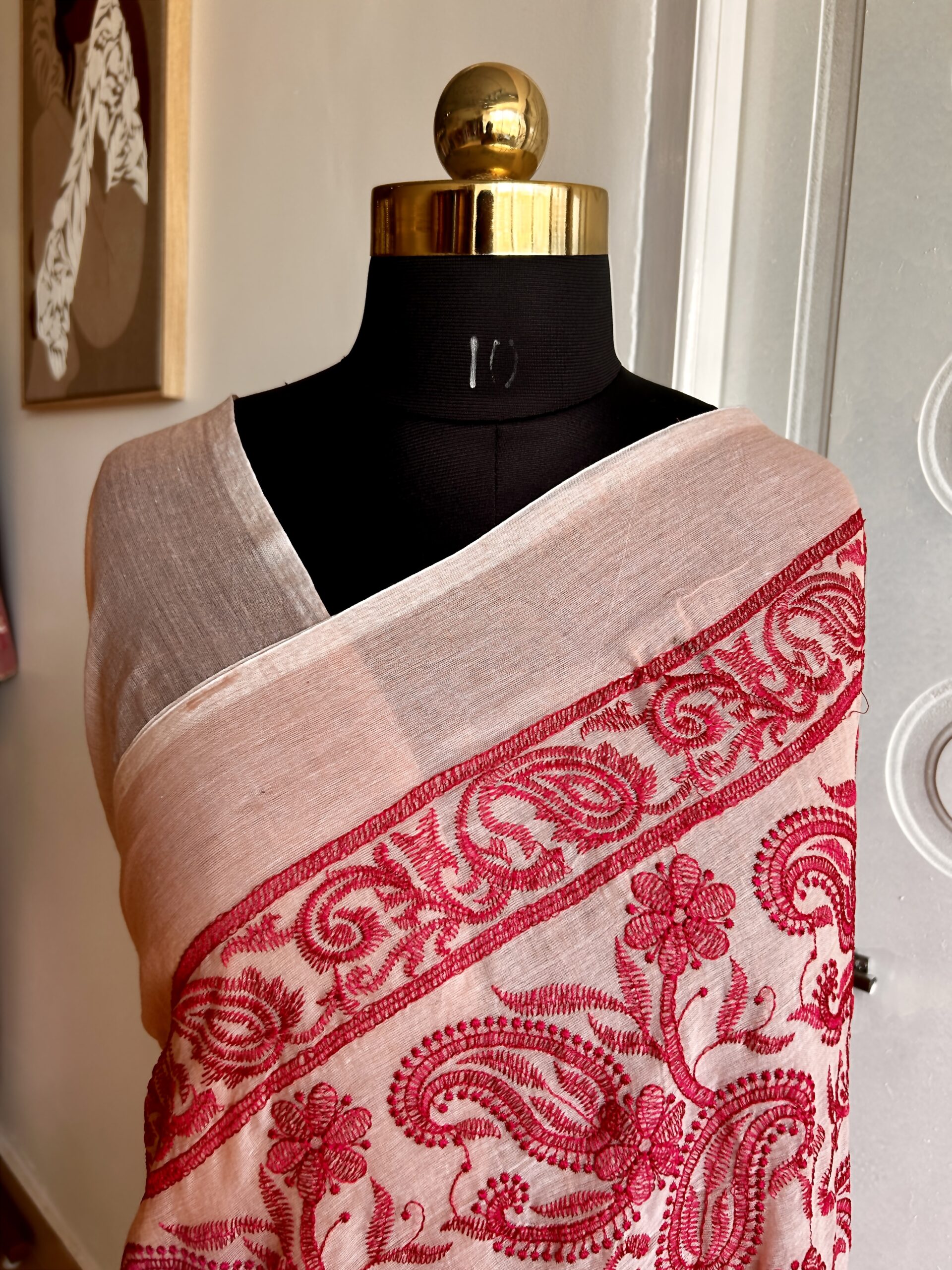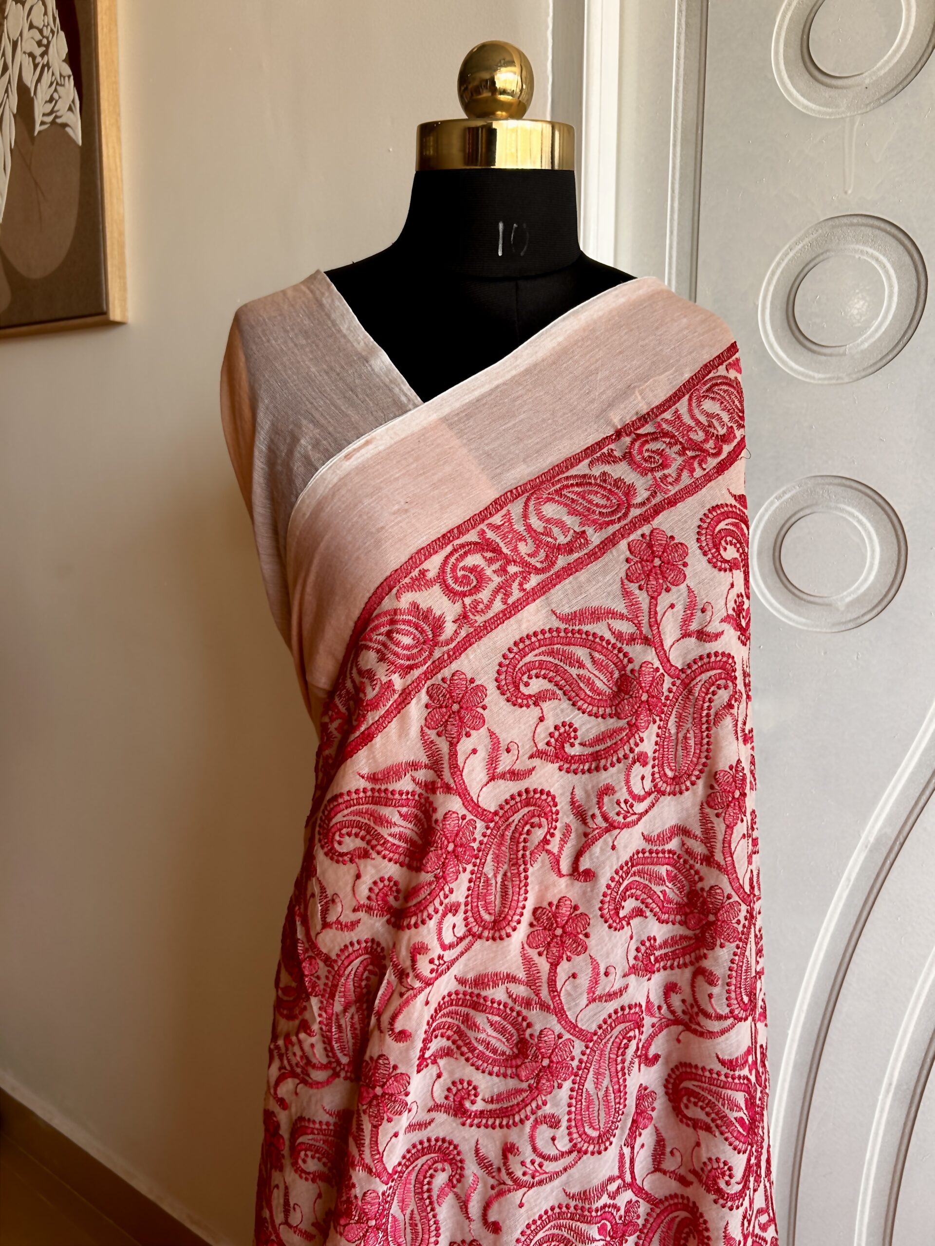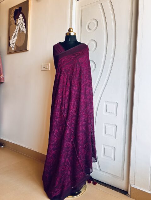Ideal for summer wear, casual gatherings, office elegance, and intimate festivities, this saree blends traditional craftsmanship with understated sophistication. Pair it with minimal jewellery to let the embroidery shine.