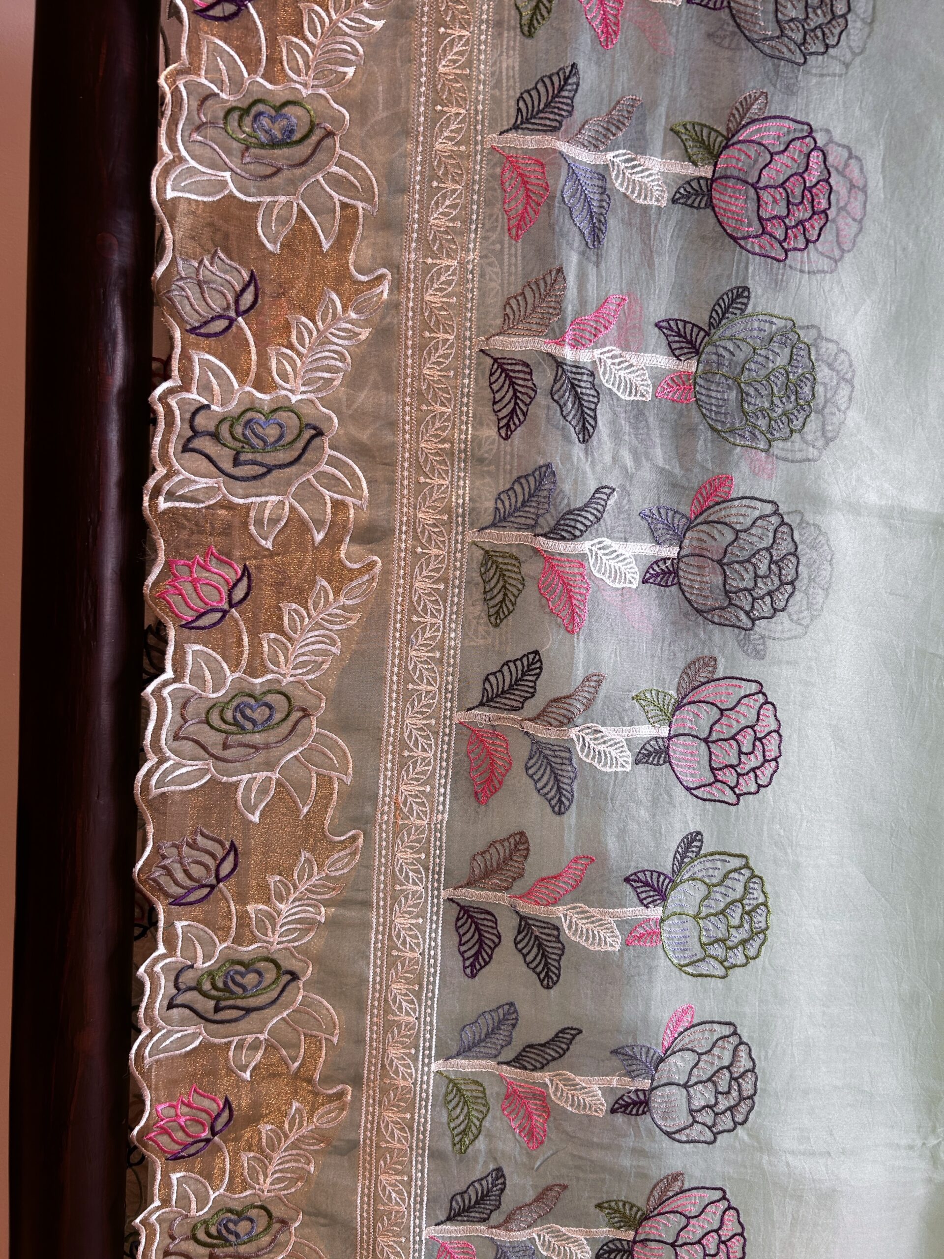 Elevate your look with this lightweight organza saree featuring a beautifully crafted tissue embroidered attached border. Delicate thread embroidery adds refined detailing along the edges, creating a perfect blend of elegance and modern charm. Its soft drape and subtle sheen make it ideal for festive occasions, celebrations, and contemporary styling.