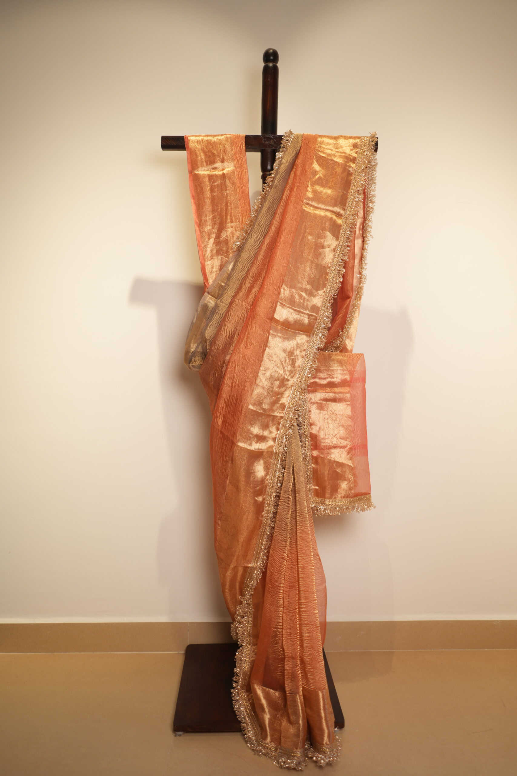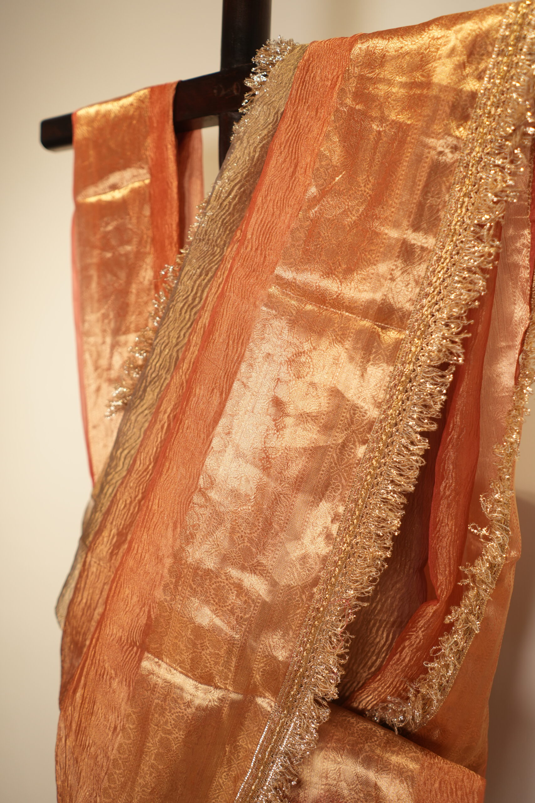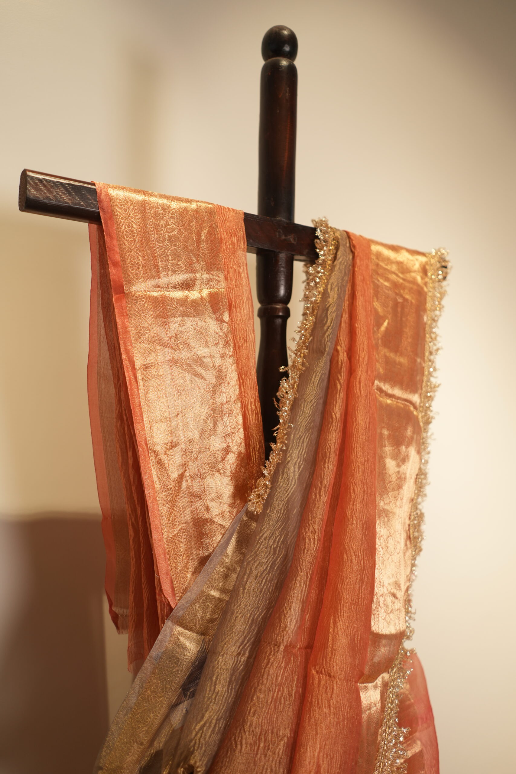 Step into timeless grace with this exquisite Banarasi tissue saree, beautifully woven with shimmering gold zari for a rich and luminous finish. The saree features an intricately crafted border that highlights the mastery of traditional Banarasi weaving, further enhanced with a customized attached border for a unique and elevated look. Lightweight yet regal, this saree drapes effortlessly, making it perfect for weddings, festive occasions, and grand celebrations. A refined blend of heritage craftsmanship and contemporary detailing — truly a statement piece for every wardrobe.